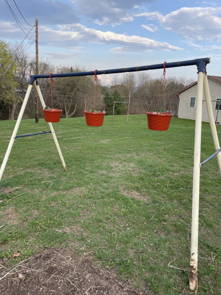 As for our garden, on Saturday we refurbished an old metal swing set to use for our hanging pots, and we planted three strawberry plants! This will keep the strawberries away from our kids who like to pick them green.